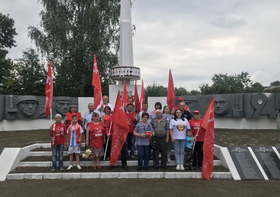 Путь краснознамённой автоколонны начался в п. Климово с возложения цветов к Вечному огню. Там же первый секретарь местного отделения КПРФ Климовского района М.М. Терещенко за проявленные мужество и отвагу при исполнении служебных обязанностей вручил медаль ЦК КПРФ «80 лет Великой Победы» коммунисту Евгению Станиславовичу Анисенко. Торжественная церемония состоялась возле Мемориала в память климовчан, павших за свободу и независимость нашей Родины. Во время Великой Отечественной войны более 26 тысяч жителей Климовского района ушли защищать Родину. Более 9 тысяч из них погибли на поле боя, не вернулись домой, а две с половиной тысячи считаются без вести пропавшими. Рядом с Вечным огнём на гранитных плитах высечены имена и фамилии девяти Героев Советского Союза – уроженцев Климовского района: В.Л. Гутин, П.С. Ковалевский, И.К. Дьяченко, А.З. Носовец, А.Б. Панов, А.Ф. Спирин, Е.Е. Белов, И.К. Кравцов и А.И. Фокин.
