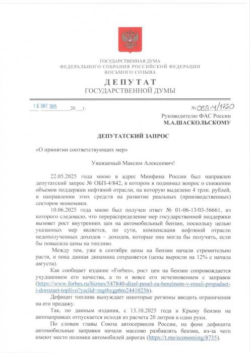 Я же со своей стороны направил депутатский запрос в ФАС России в котором потребовал: