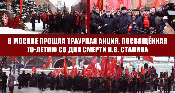 5 марта, в 70-ю годовщину со дня смерти И.В. Сталина, в Москве прошла траурная акция. Коммунисты, комсомольцы и представители лево-патриотических движений возложили цветы к Мавзолею В.И. Ленина и могиле И.В. Сталина у Кремлёвской стены. Колонну под красными знаменами возглавил Председатель ЦК КПРФ Г.А. Зюганов.