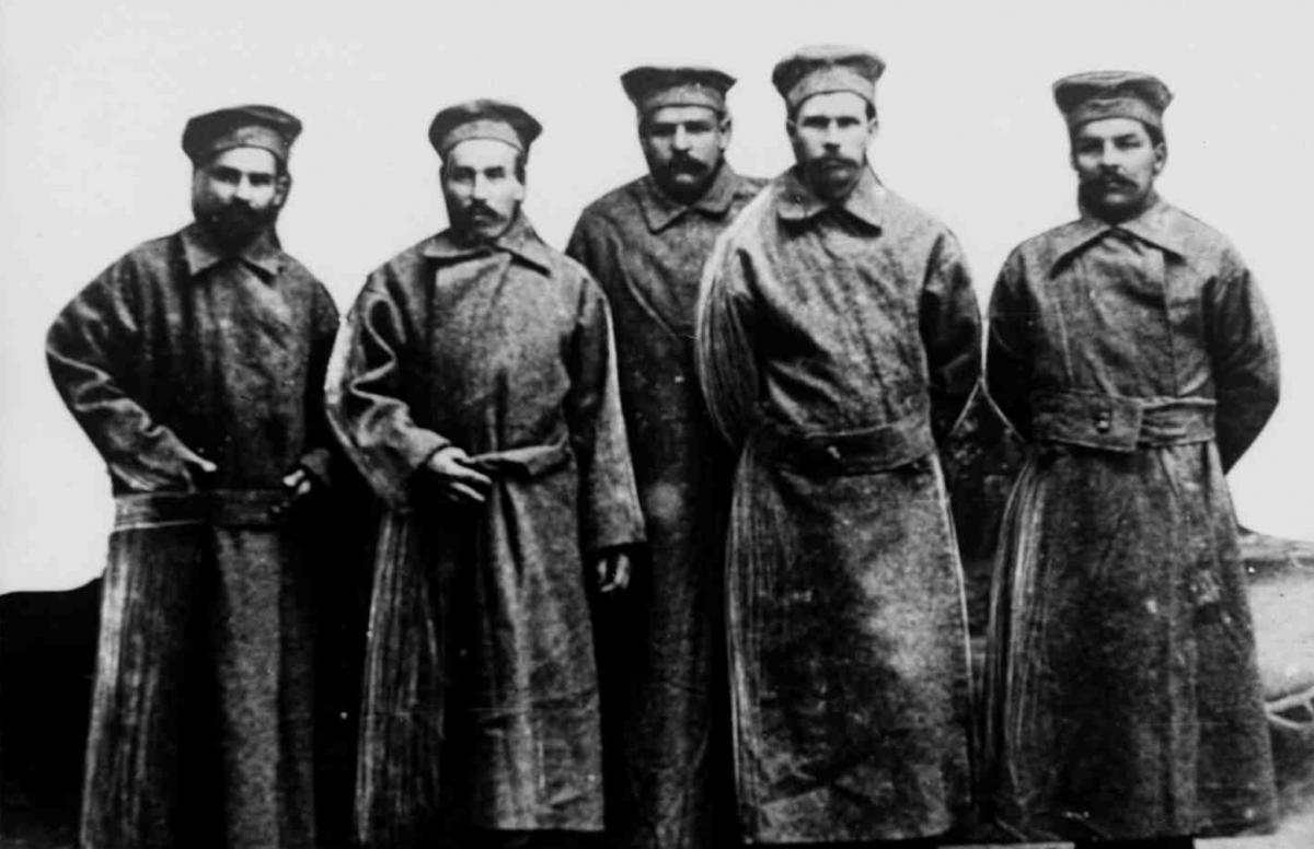 На снимке: большевики-депутаты IV Госдумы в ссылке: слева направо – Г.И. Петровский, М.К. Муранов, А.Е. Бадаев, Ф.Н. Самойлов, Н.Р. Шагов.