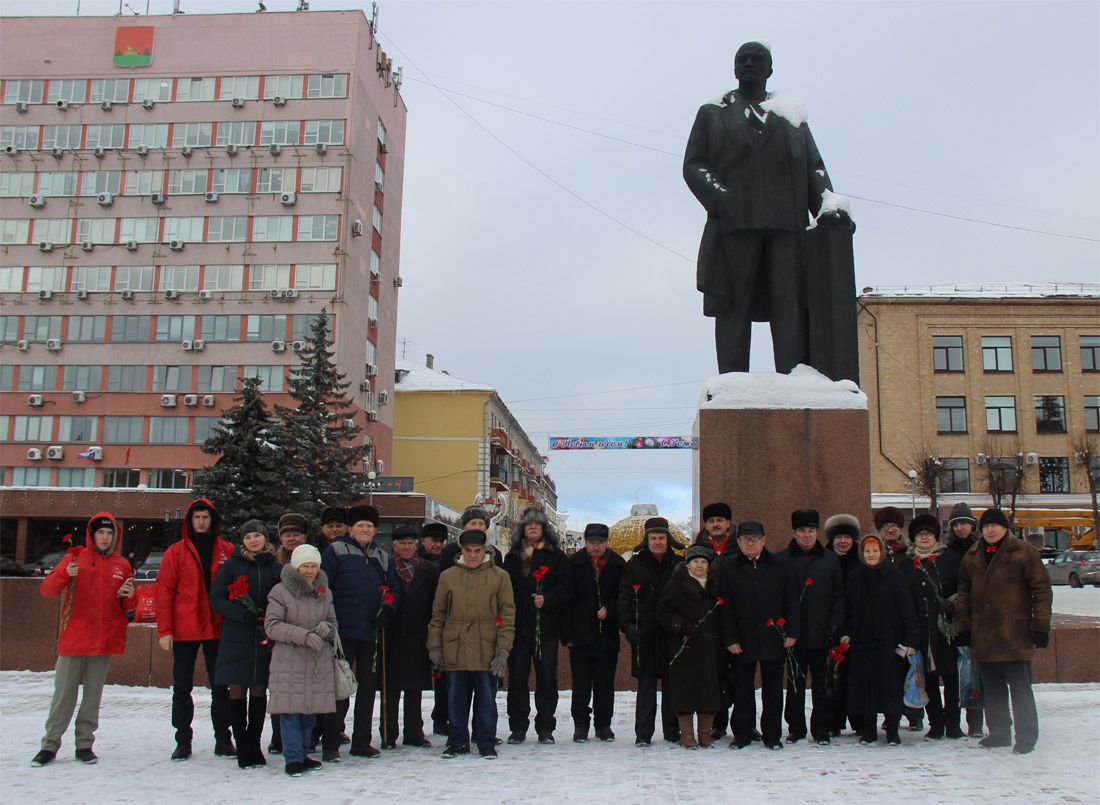 На площади Ленина в Советском районе г. Брянска новогодние украшения стоят последние деньки – вскоре их уберут до следующего года. Но собиравшиеся на площади коммунисты и сторонники партии пришли не к ним. Несмотря на рабочий день, к полудню у памятника основателю советского государства В.И. Ленину собралось около сорока человек. И хоть термометр на ближайшем здании показывал ноль, но морозец чувствовался.