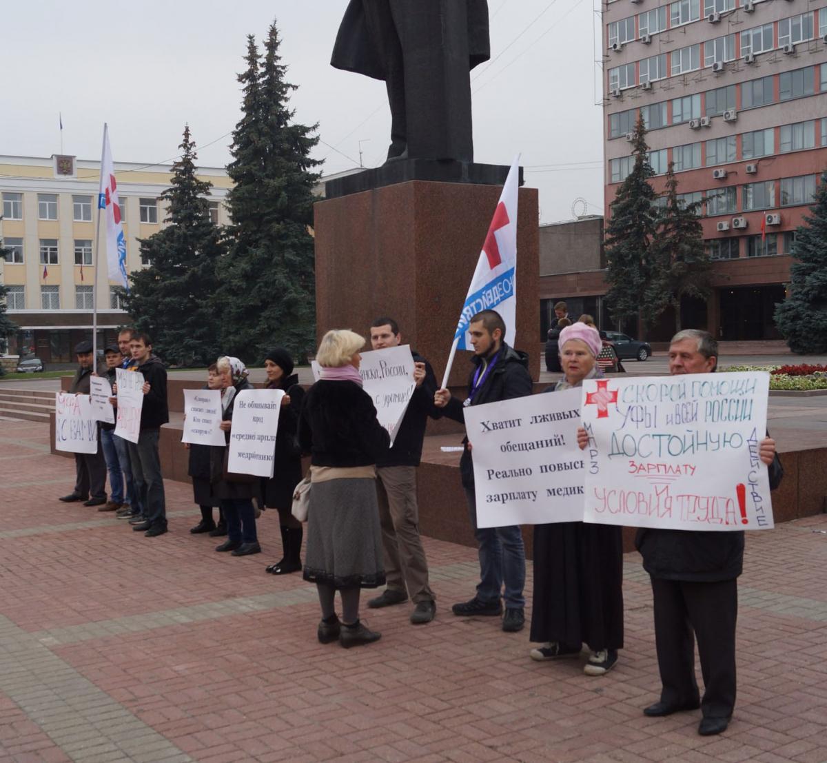 Несколькими днями ранее пикет солидарности с протестующими медиками Уфы был проведён московскими врачами у здания Минздрава России. В Петербурге медработники – активисты «Действия» – провели акцию в виде одиночных пикетов, не требующих процедуры согласования с властями.