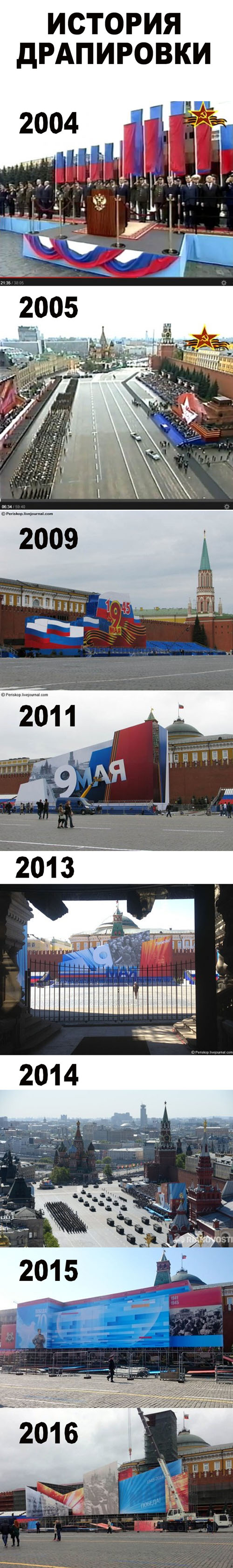 Эта милая традиция возникла при Путине. Первый раз Мавзолей скрыли рядом триколоров в 2004 году. На следующий год этого показалось мало, и была сооружена стеночка. Впоследствии вокруг Мавзолея стали сооружать подобие чернобыльского саркофага, чтобы он ниоткуда не был виден. И несмотря на обращения ветеранов войны, это остается принципиальным – Мавзолей надо прятать! Но почему?