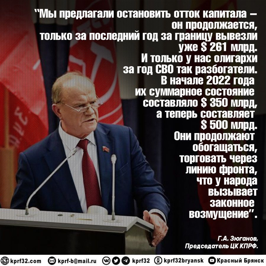 Мы предлагали остановить отток капитала – он продолжается, только за последний год за границу вывезли уже 261 млрд долларов. И только у нас олигархи за год СВО так разбогатели. В начале 2022 года их суммарное состояние составляло 350 млрд долларов, а теперь составляет 500 млрд. Они продолжают обогащаться, торговать через линию фронта, что у народа вызывает законное возмущение.