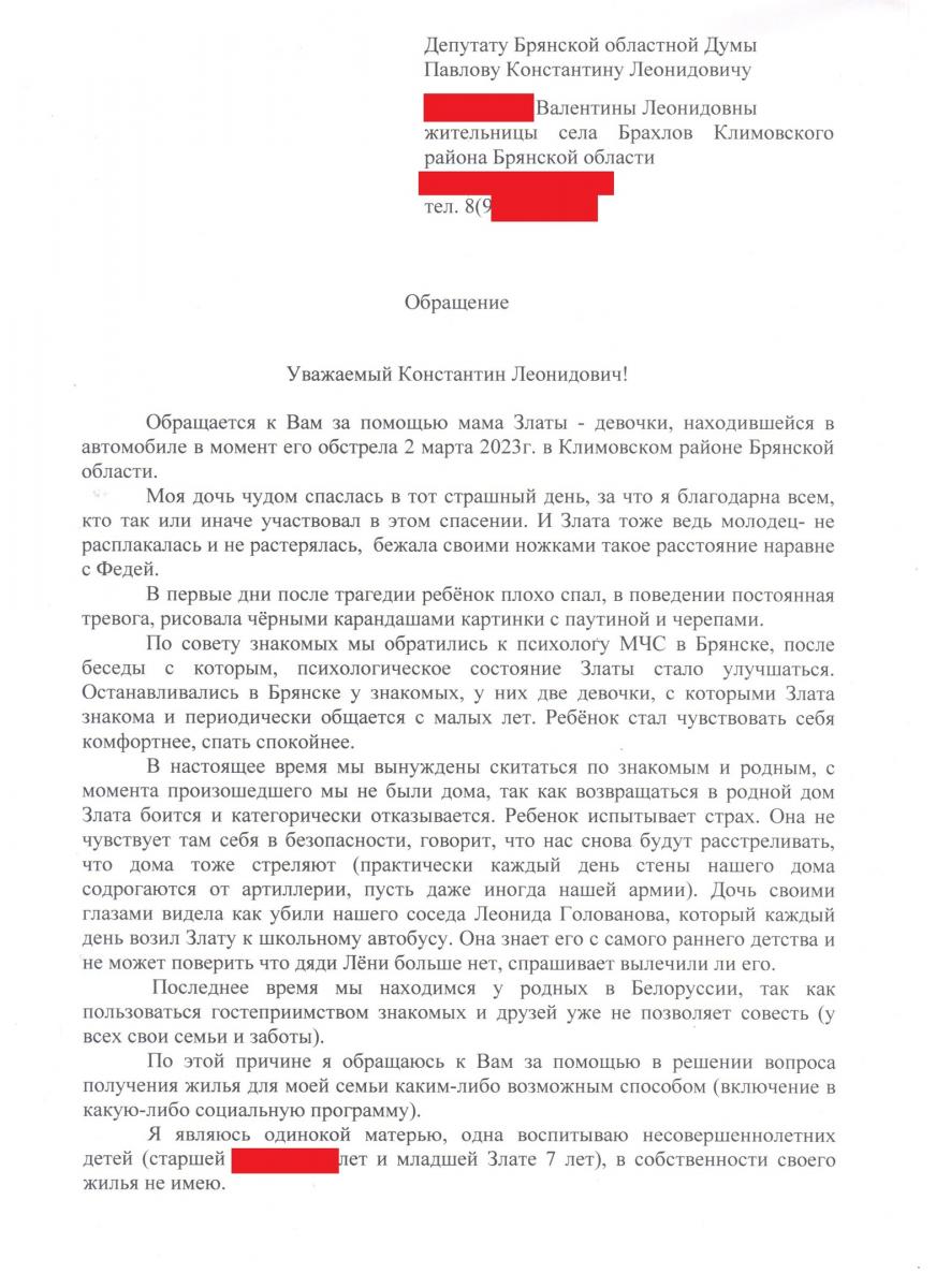 К депутату К. Павлову обратилась мама 7-летней девочки Златы, находившейся в автомобиле в момент его обстрела группой украинских диверсантов 2 марта в Климовском районе, и которая вместе с Федей и другой первоклассницей Леной чудом спаслась в тот страшный день. Их семья была вынуждена уехать из села Брахлов.