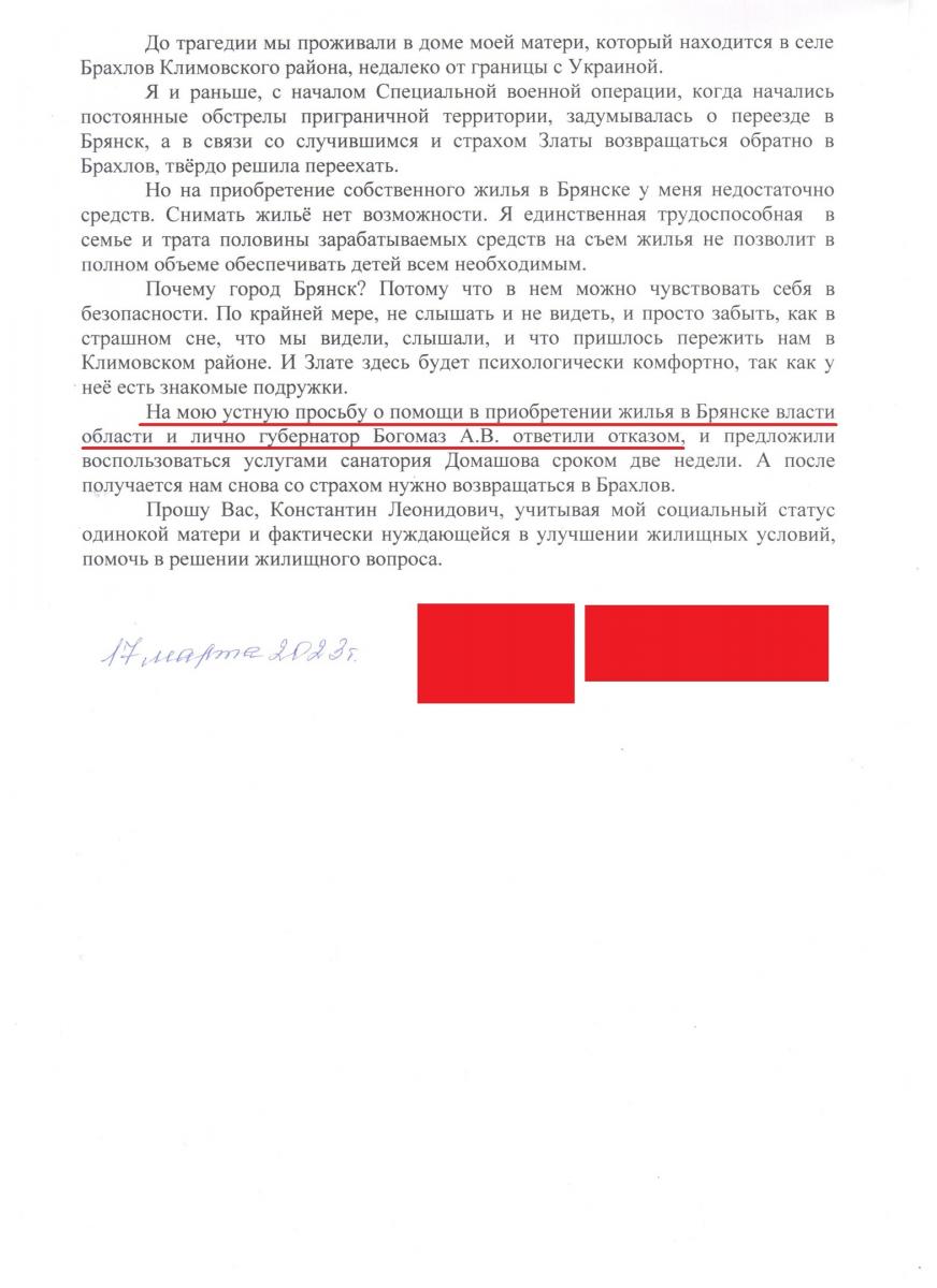 Как следует из заявления Валентины Леонидовны, в настоящее время одинокая мать с двумя детьми вынуждена скитаться по знакомым и родным, поскольку возвращаться в родной дом Злата боится и категорически отказывается, а возможности купить жильё в Брянске, чтобы быть в безопасности, семья не имеет. Поэтому при встрече с брянским губернатором А.В. Богомазом женщина попросила его помочь в приобретении жилья в областном центре. Однако он ответил отказом!