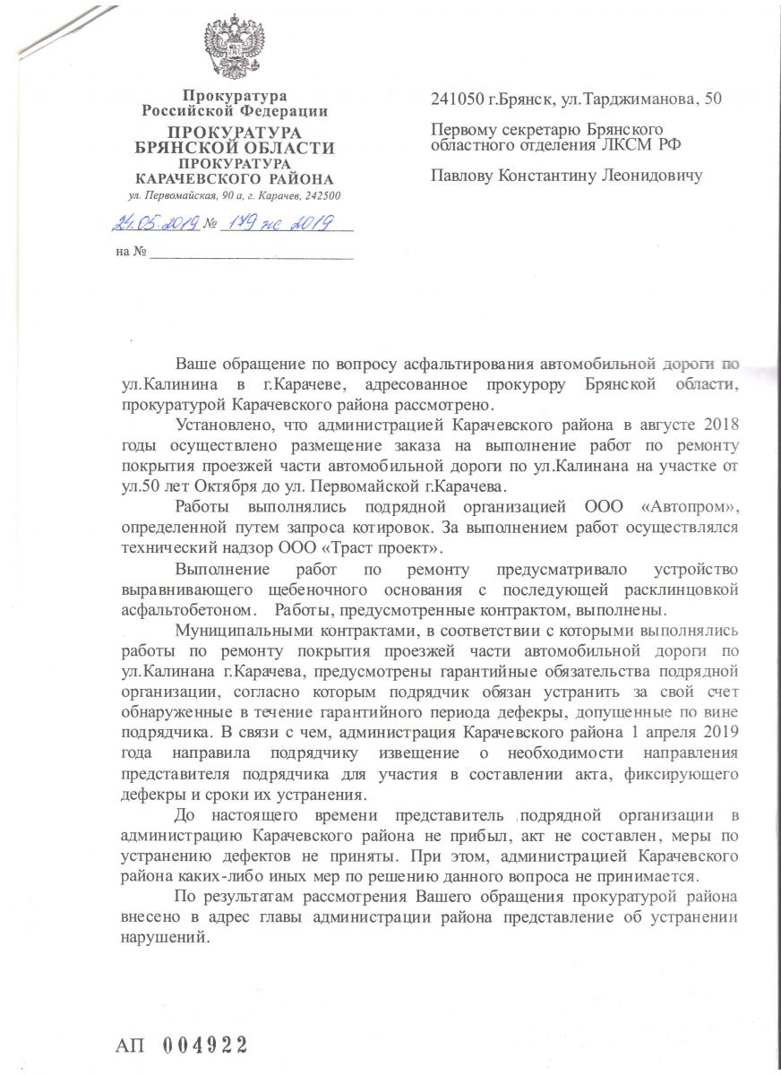 Была проведена проверка в ходе которой было выявлено, что администрацией Карачевского района и лично Л.В. Лужецкой за неполных 2 последних месяца не было предпринято никаких мер по решению вопроса устранения подрядчиком допущенных при ремонте части ул. Калинина дефектов. И это – несмотря на неоднократные возмущения жителей.