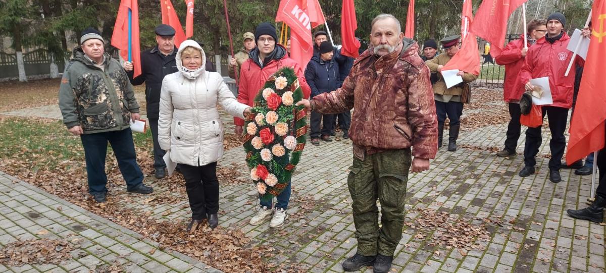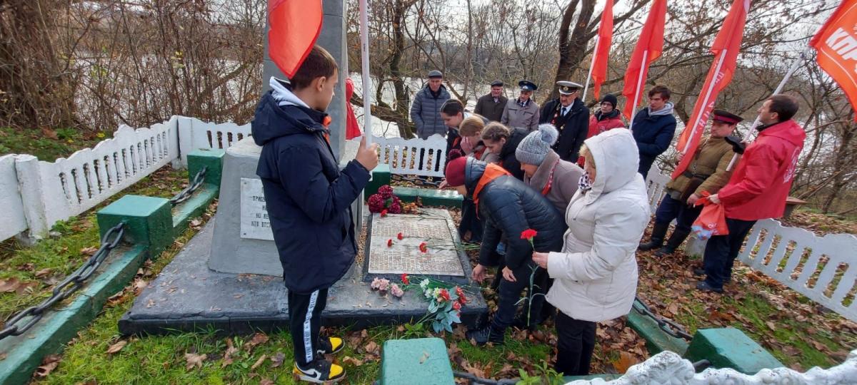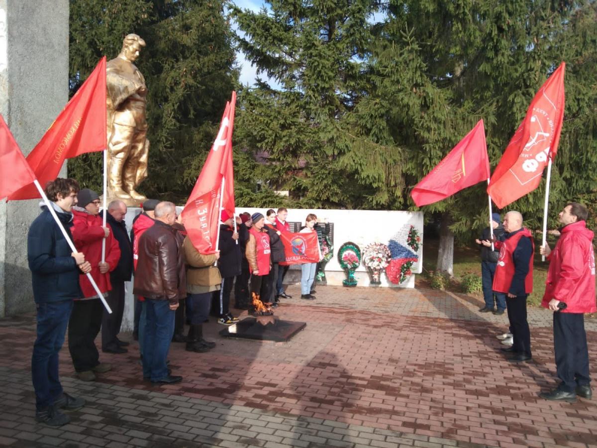 После небольшого митинга, минуты молчания и возложения цветов мы отправились в Выгоничи. Там, у воинского мемориала памяти погибших в боях за освобождение Выгоничей и Вечного огня нас встречали местные коммунисты во главе с первым секретарём райкома КПРФ Александром Алексеевичем Симоновым. Там же прошёл небольшой митинг памяти, на котором участникам Вахты рассказали о значении Великого Октября и о том, как жители Выгоничей хранят и чтут память земляков, погибших в годы Великой Отечественной войны. А также – о самой известной операции партизан – взрыве Голубого моста, который хорошо виден от мемориала.
