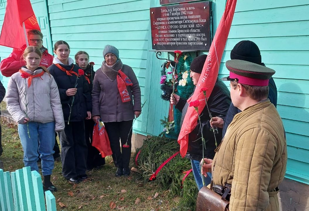 Мы узнали, что в ночь на 7 ноября, в день 25-й годовщины Октября в деревне Чернь (ныне Берёзовка) Суземского района впервые прозвучала эта песня. В Берёзовке в память о данном событии на местном ДК размещена памятная доска. В год 80-летия гимна деревне присвоено звание «Населённый пункт партизанской славы».