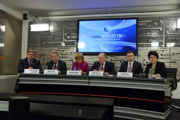 В пресс-конференции также приняли участие члены Президиума, секретари ЦК КПРФ, депутаты Госдумы С.П. Обухов и Ю.В. Афонин, секретарь ЦК КПРФ, депутат Госдумы П.С. Дорохин, первый секретарь Санкт-Петербургского городского отделения КПРФ О.А. Ходунова, депутаты Госдумы В.В. Потомский, А.А. Ющенко и А.П. Тарнаев.