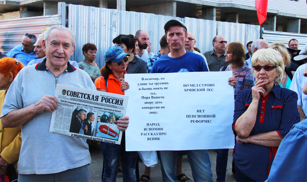 Волна протестных митингов прокатилась по всей Брянщине. Несмотря на запреты и различные препоны единороссовскй власти, акции протеста прошли в Сельцо, Карачеве, Навле, Выгоничах, во многих населенных пунктах прошли одиночные пикеты, на проведение которых не требуется специального разрешения властей. Комсомол Брянщины провел акцию «Пенсия в гробу для депутатов поддержавших пенсионную реформу». У стен Брянской областной думы и на площади Ленина комсомольцы предлагали депутатам партии жуликов и воров увидеть свою пенсию в символическом гробу. И хотя никто из депутатов-единороссов, поддержавших антинародную грабительскую пенсионную реформу, к ребятам так и не осмелился выйти, но жители города, оценив задумку молодых коммунистов, с нелицепрятными пожеланиями бросали деньги в гроб для депутатов партии жуликов и воров.