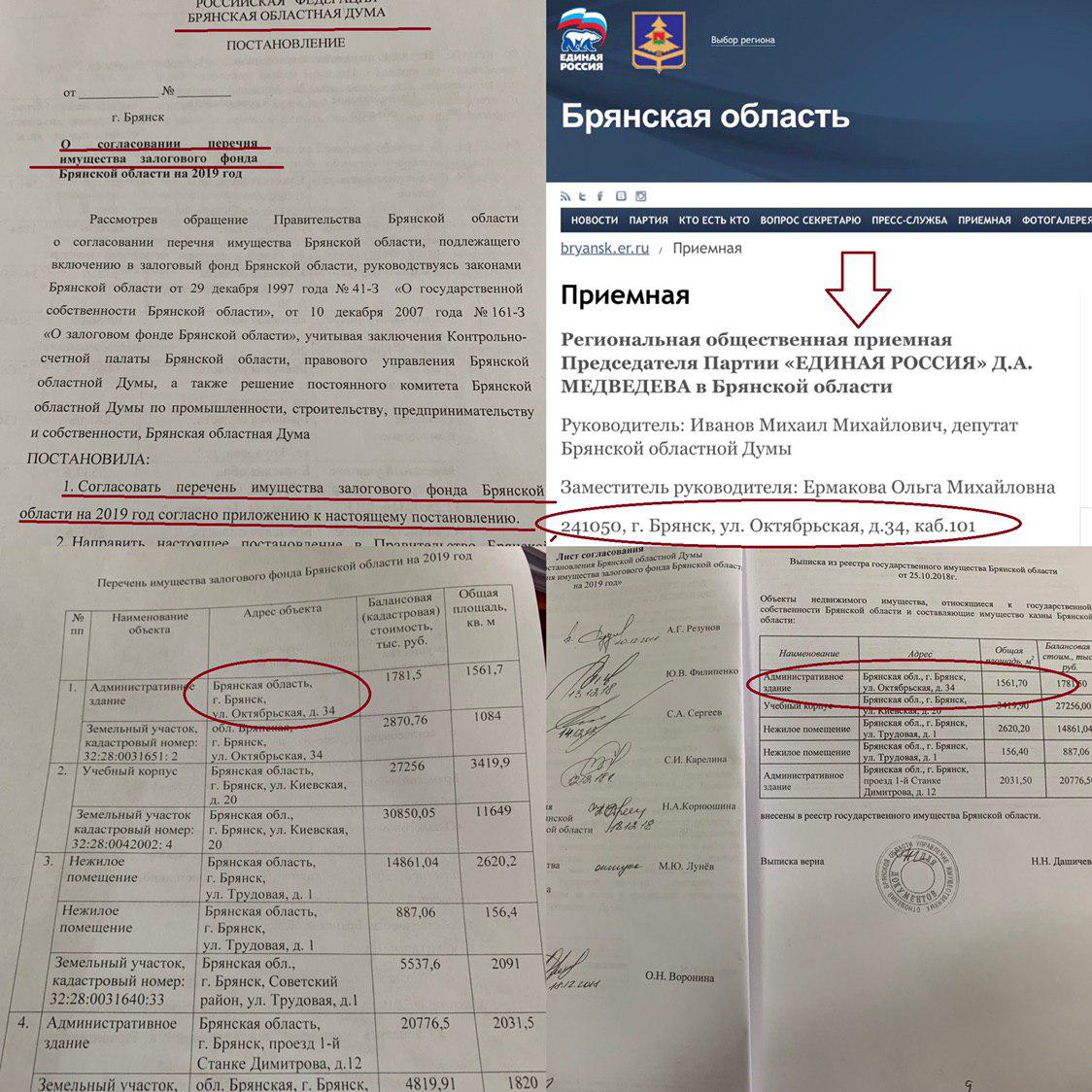 Приёмная лидера партии «Единая Россия» и премьера Дмитрия Медведева в Брянске расположена по адресу: улица Октябрьская, дом 34. Само здание находится в областной собственности и оценивается местными чиновниками в сумму 1,78 млн рублей. Оно стало одним из пяти объектов, которые были включены в залоговый фонд региона на 2019 год вместе с колледжем искусств и культуры, отделением центра занятости населения и двумя нежилыми строениями.