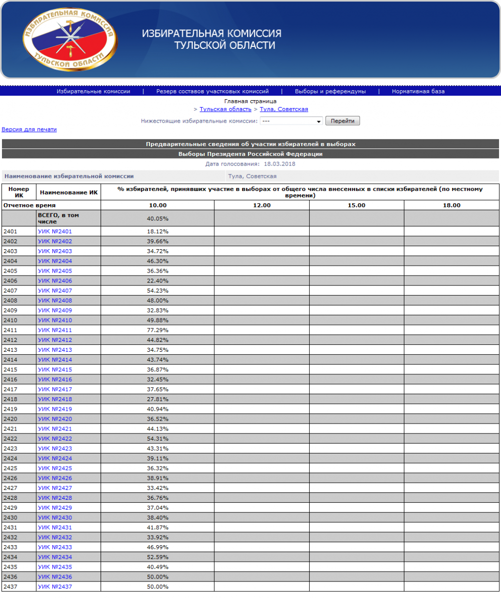 На сайте избирательной комиссии Тульской области появилась информация о явке на президентские выборы в России, которые состоятся в марте 2018 года. На это обратило внимание издание Znak.com. Информацию уже убрали с сайта Тульского избиркома, но проценты можно увидеть в кэше Google. Согласно ним, на 10 утра 18 марта на участок №2401 пришли 40% человек, на №2406 чуть больше 22%, а на №2411 — около 77%. В среднем явка не опускается ниже половины избирателей.