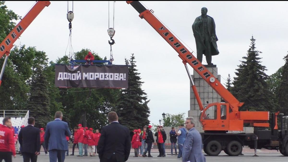 Перед началом встречи, активисты подготовились к мероприятию – на площади В.И. Ленина два крана «Ульяновец» подняли лозунг: "Долой Морозова» и "Слава Ленину»! Дополнительно к грузоподъёмным машинам цепью себя приковали активисты-общественники из Тереньги: Наири Чатинян, Андрей Ушанов, Виктор Вишняков, а также активист Денис Штылёв.