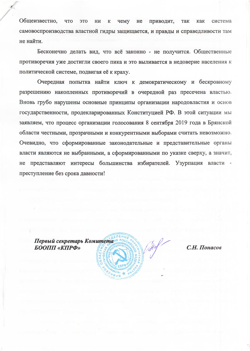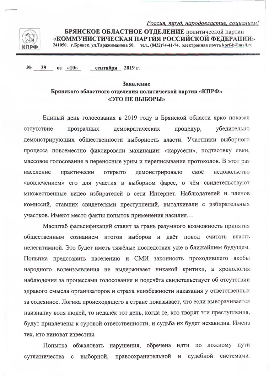 Заявление Брянского областного отделения политической партии «КПРФ» «ЭТО НЕ ВЫБОРЫ».